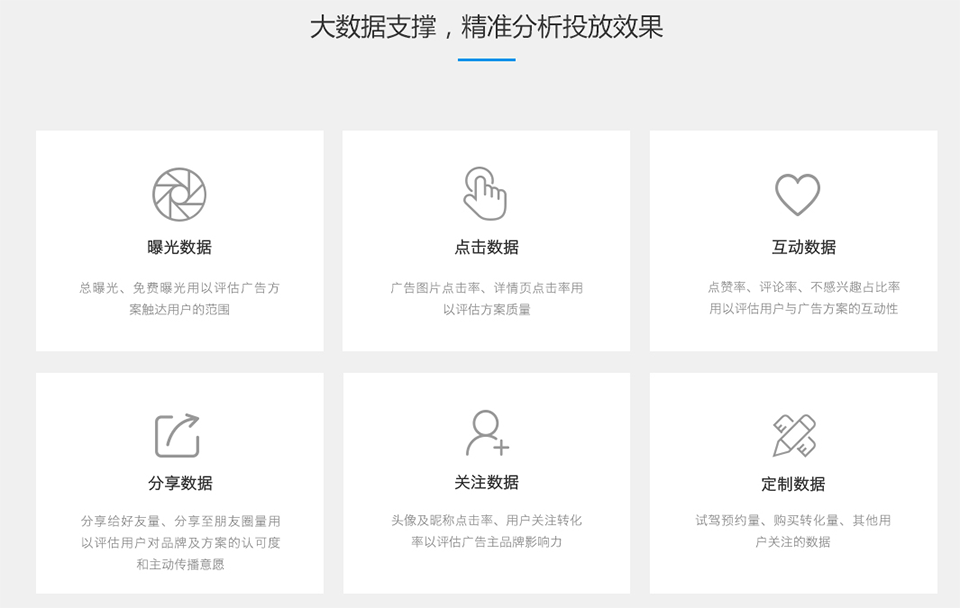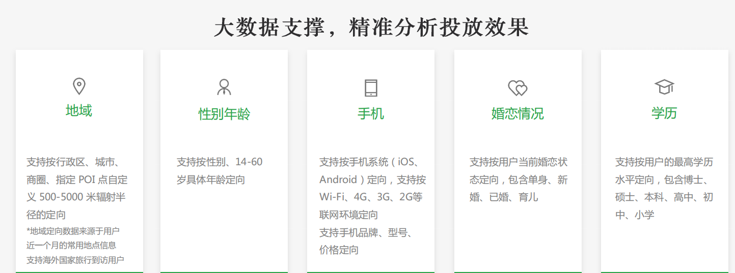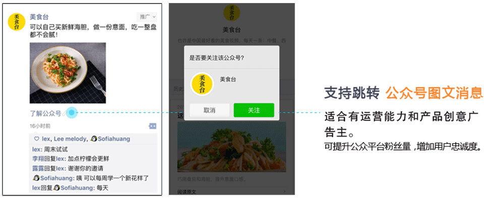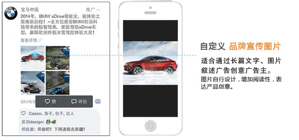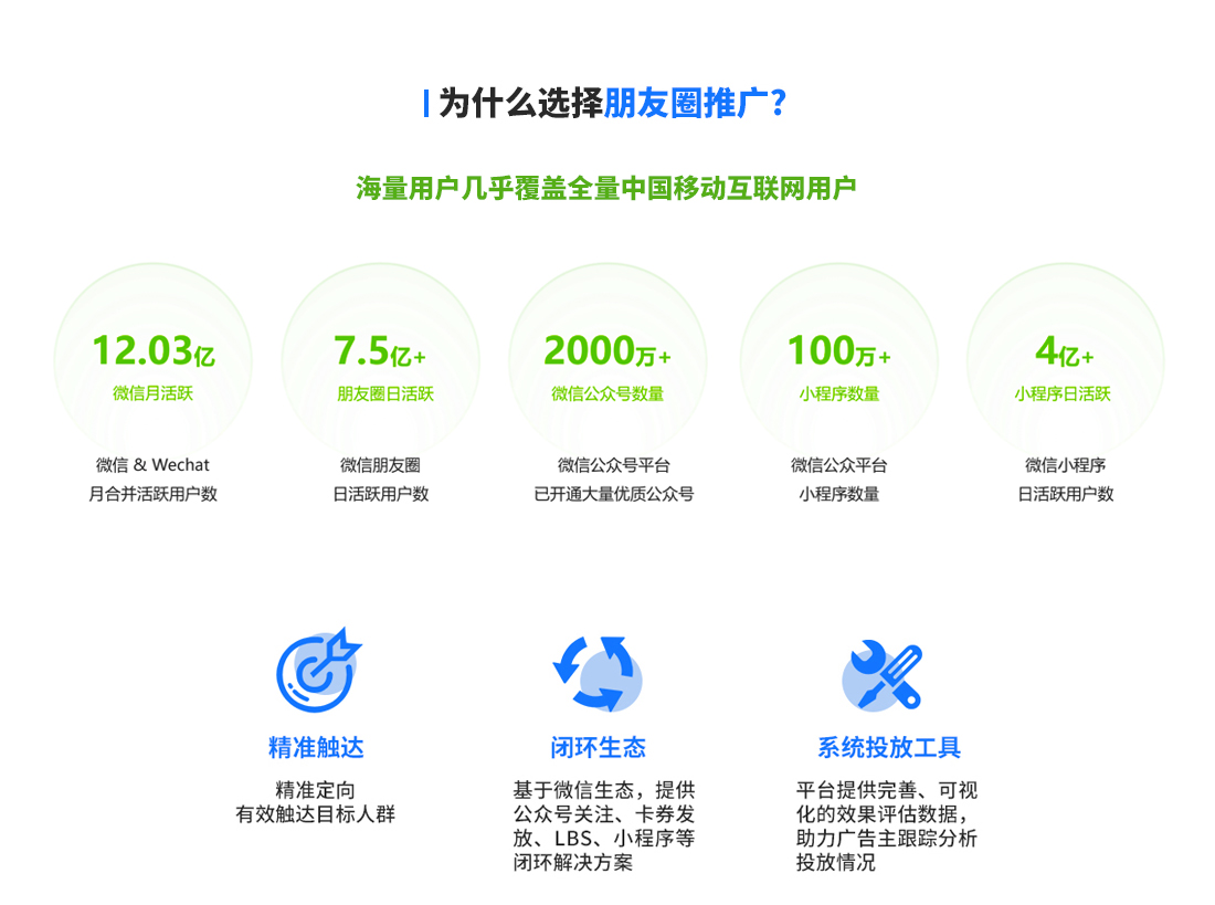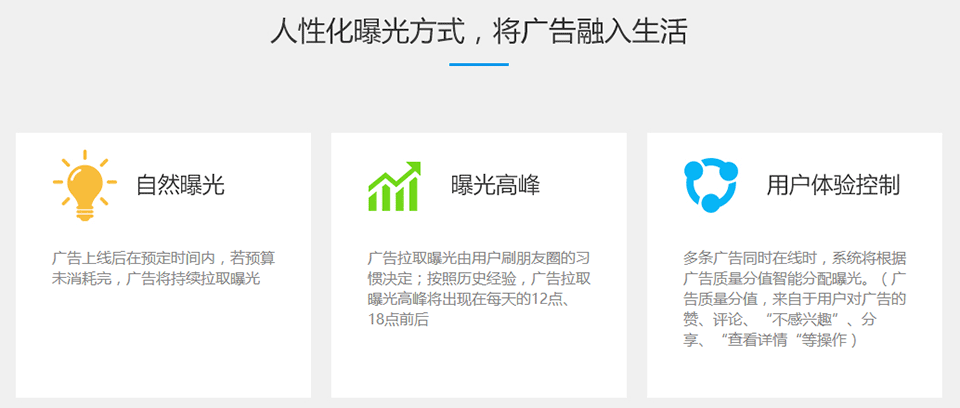 微信廣告包括微信朋友圈廣告和微信公眾號廣告。微信朋友圈廣告是基于微信公眾賬號生態體系,以類似朋友的原創內容形式在用戶朋友圈進行展示的原生廣告。通過整合億級優質用戶流量,朋友圈廣告為廣告主提供了一個國內獨一無二的互聯網社交推廣營銷平臺,通過微信廣告系統強制性在朋友圈內進行投放和推廣,在基于對海量微信用戶進行精準定向的同時,依托關系鏈進行互動傳播。