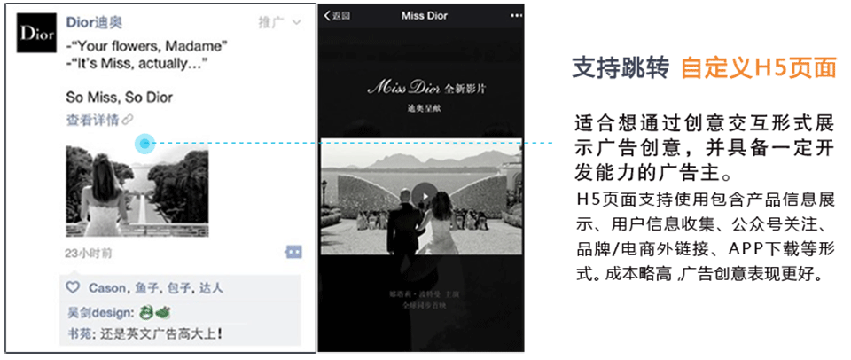 朋友圈廣告由五個部分的內容構成,包含:廣告主頭像 & 名稱、外層文案、外層圖片、“查看詳情”鏈接詳情頁、用戶社交互動等