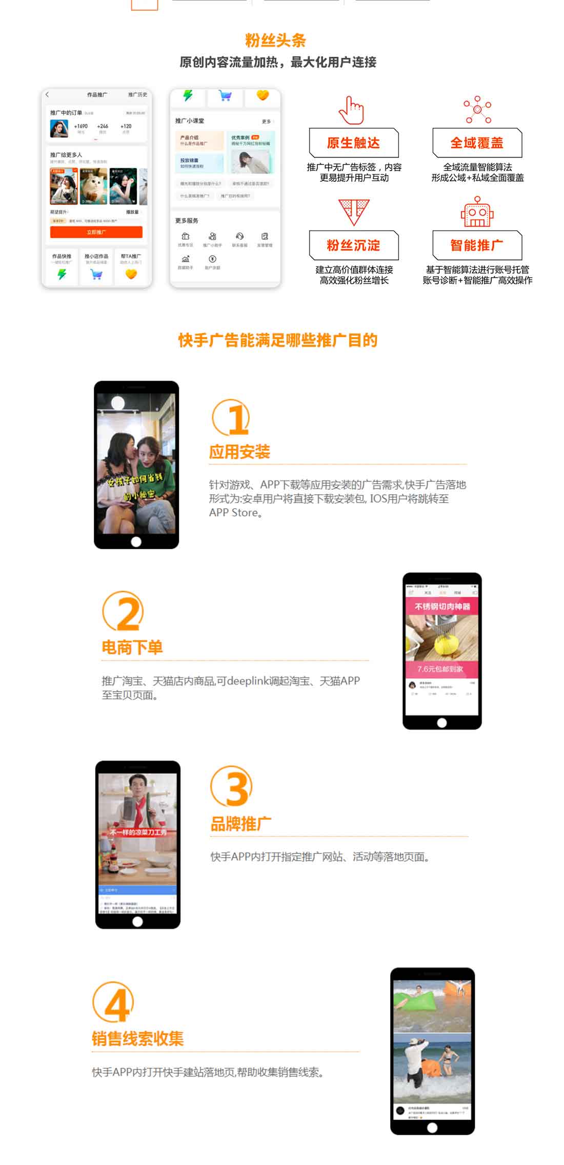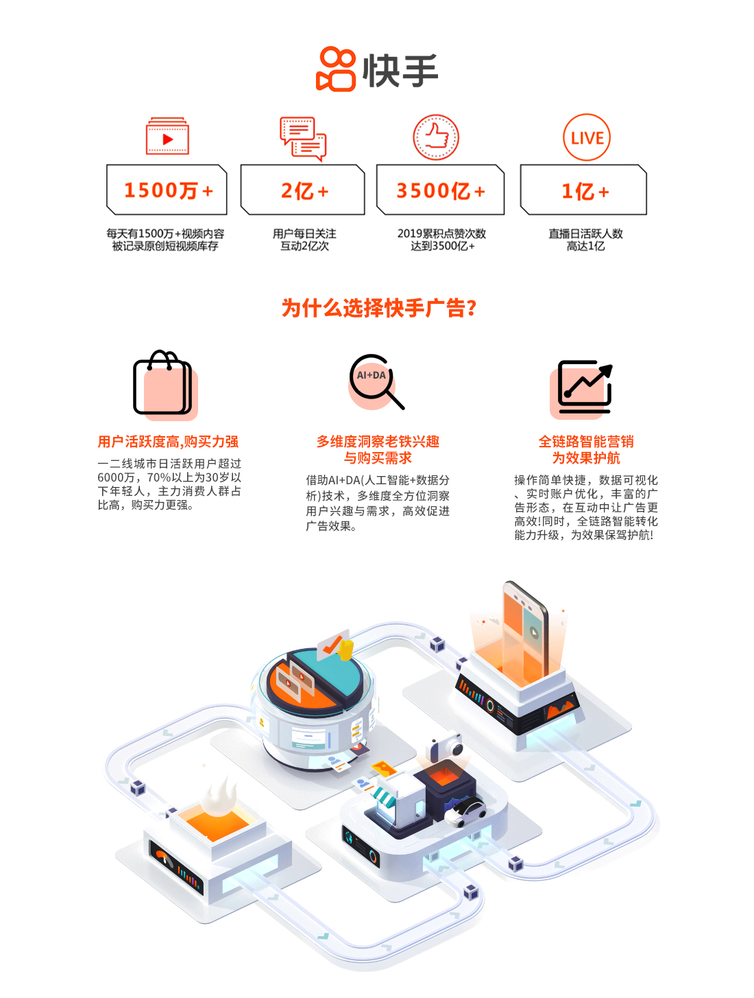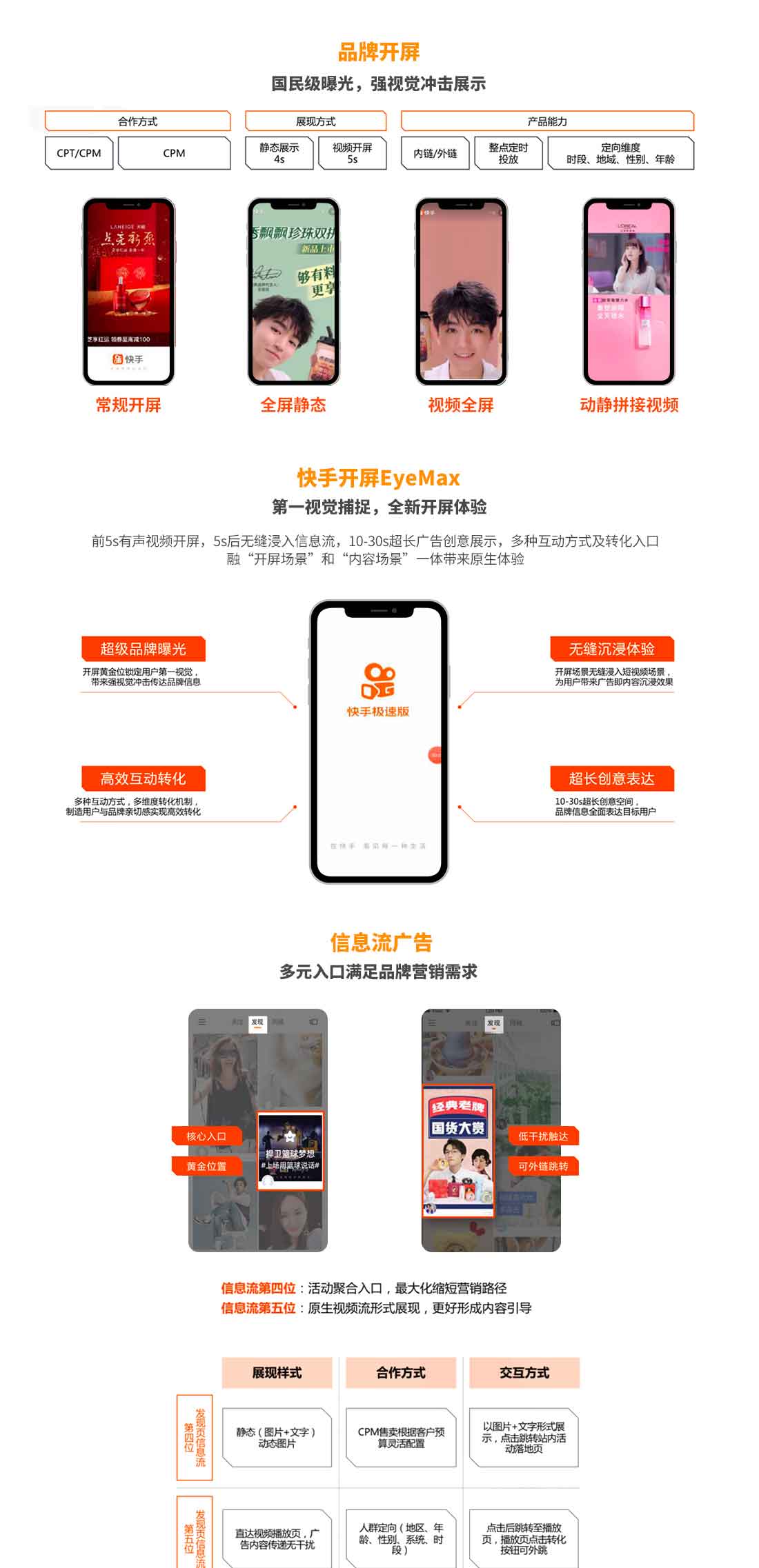 快手廣告投放可以將您的廣告投放至快手APP的信息流中,以原生廣告的形式向所有快手用戶推廣。快手擁有大量的固定用戶和活躍用戶,廣告資源位廣,廣告覆蓋廣,但是廣告成本低,廣告主對廣告投放的滿意度高。