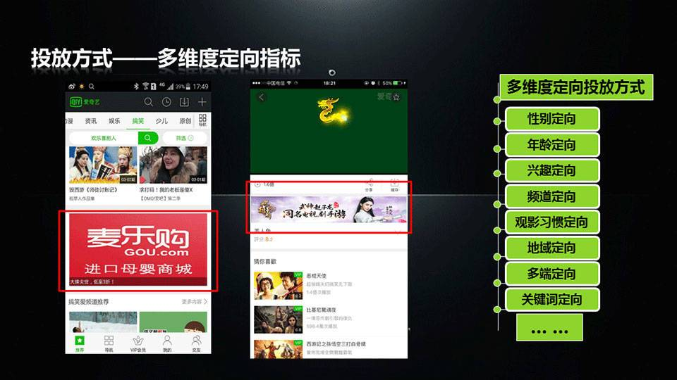 愛(ài)奇藝效果推廣平臺(tái)是依托愛(ài)奇藝海量視頻內(nèi)容及用戶(hù)、優(yōu)質(zhì)流量資源,結(jié)合企業(yè)主行業(yè)特點(diǎn),為企業(yè)主提供跨平臺(tái)、多終端的網(wǎng)絡(luò)推廣服務(wù)。同時(shí),愛(ài)奇藝效果推廣平臺(tái)利用百度大數(shù)據(jù)及強(qiáng)大技術(shù)實(shí)力,實(shí)現(xiàn)了海量觸達(dá),定向精準(zhǔn),效果顯著的廣告投放。